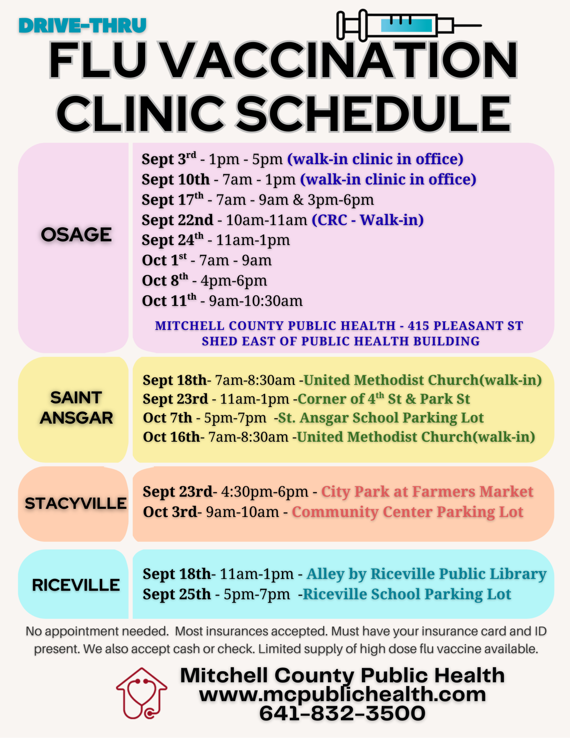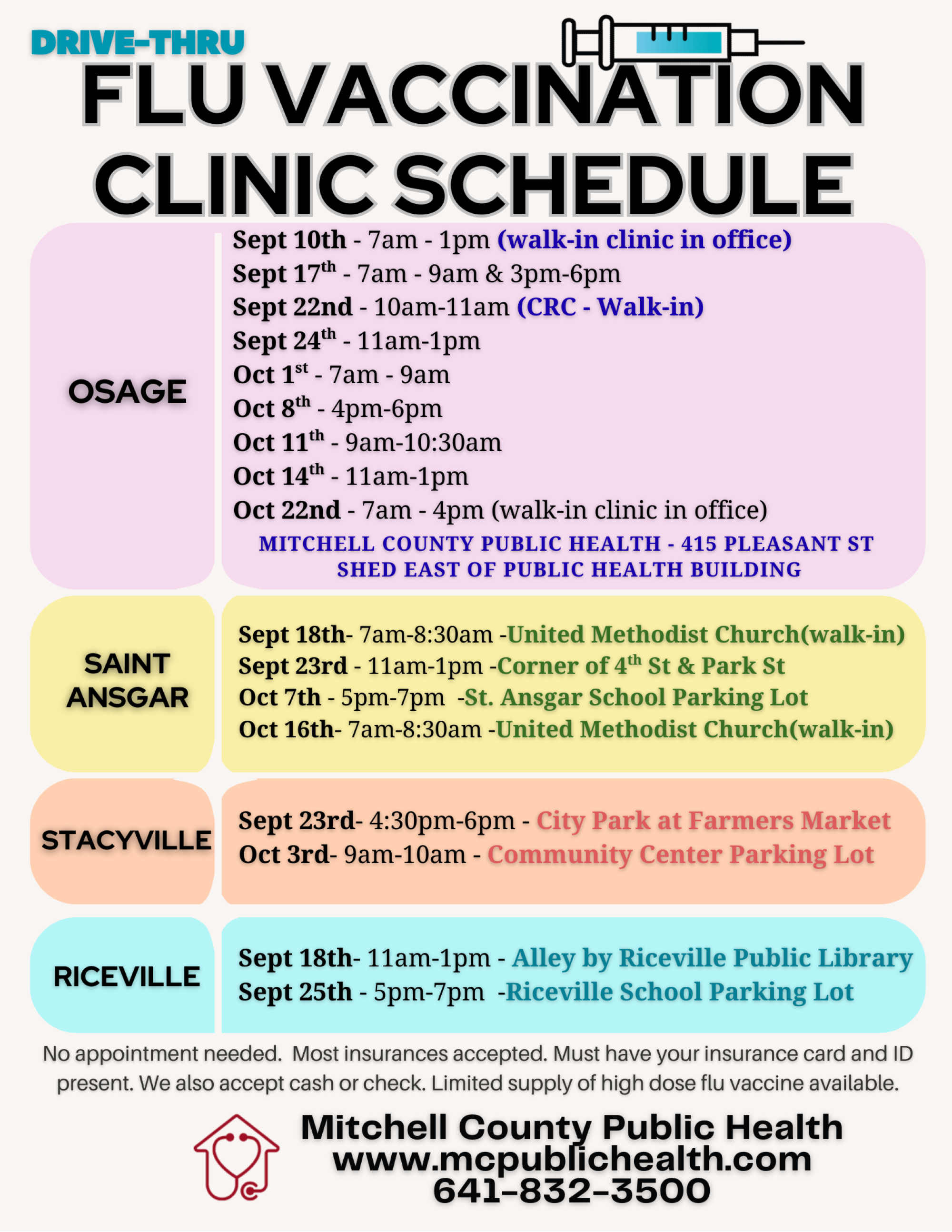 Mitchell County Public Health is offering both drive-thru and walk-in flu vaccination clinics across Mitchell County. Convenient times and locations are available in Osage, Saint Ansgar, Stacyville, and Riceville.