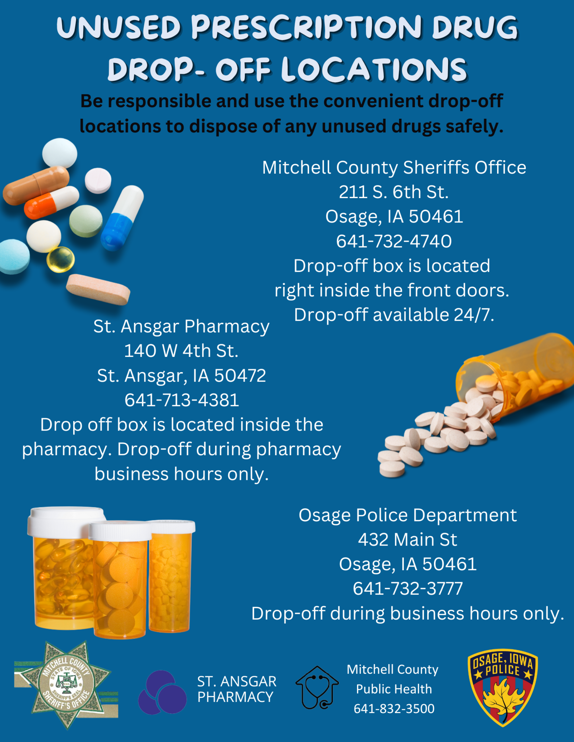 Mitchell County Public Health encourages residents to take advantage of local, year-round medication drop-off locations. These convenient options make it easy to safely dispose of medications at any time, no appointment needed.