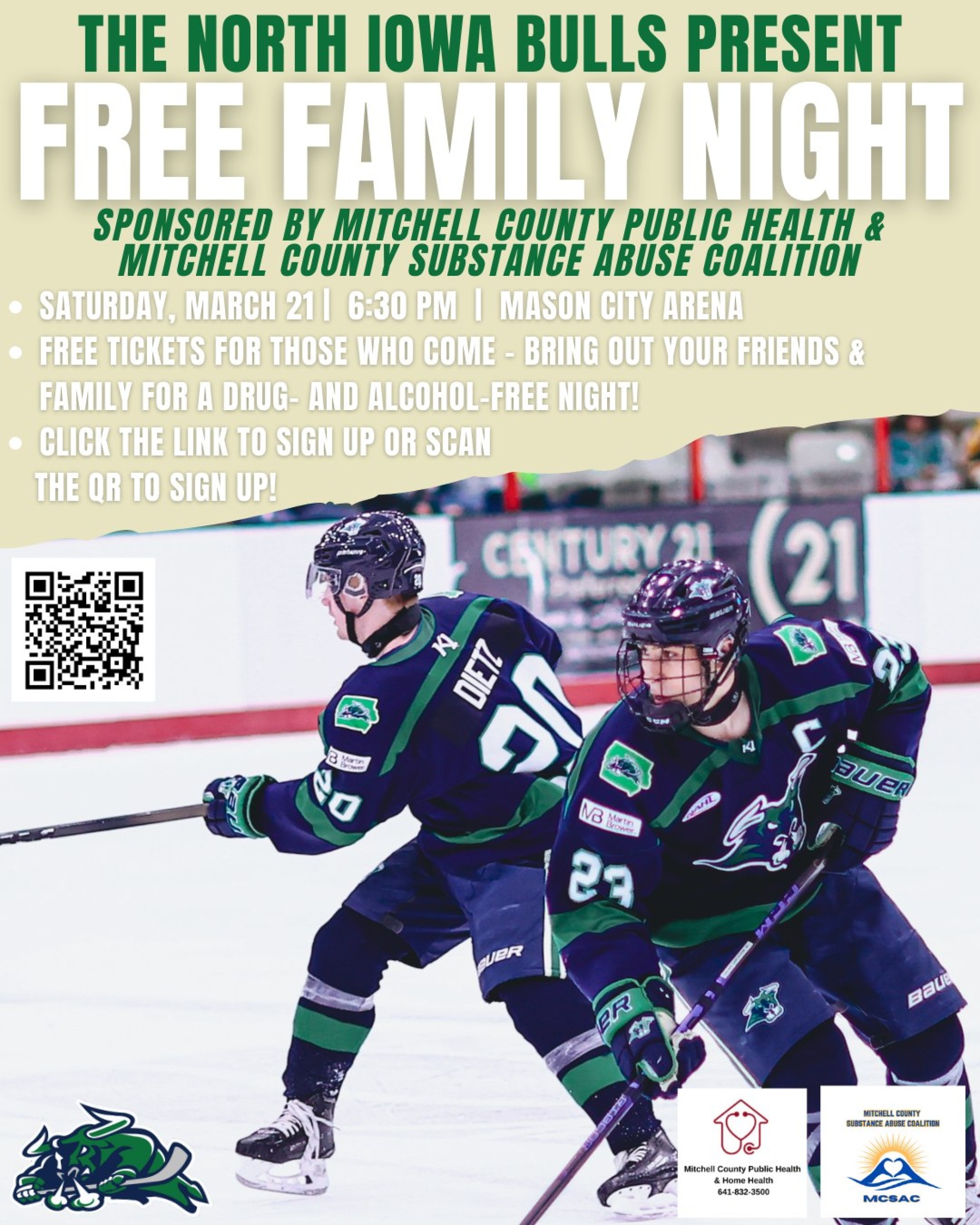 Families are encouraged to come out and cheer on the North Iowa Bulls during this special event designed to promote healthy, safe, and substance-free fun for all ages. This family-friendly evening offers Mitchell County residents the opportunity to enjoy an exciting night of hockey in a positive environment, completely free of charge.