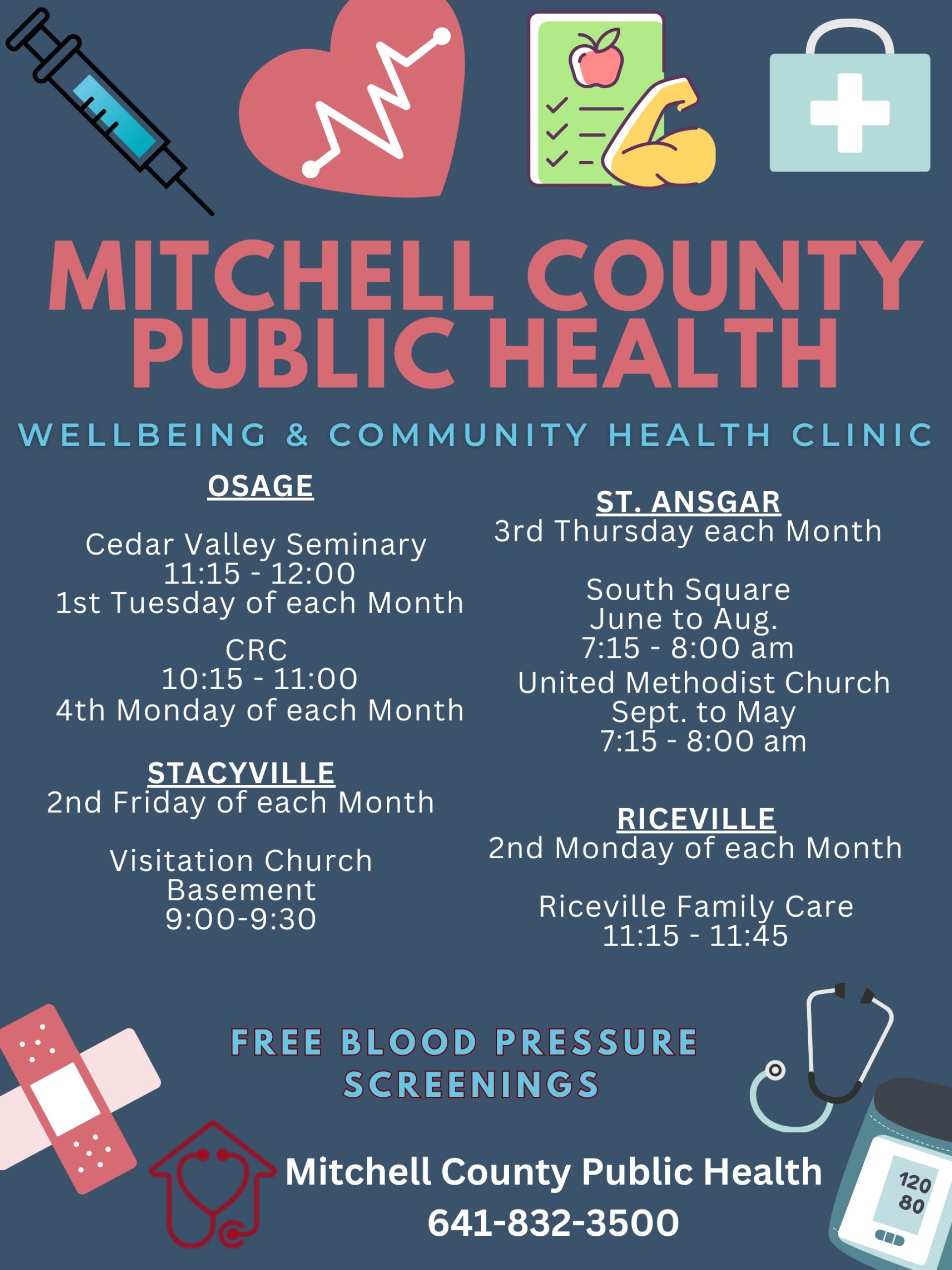 Mitchell County Public Health can provide wellness screening clinics such as Cholesterol and Blood Pressure Screenings. We can come to your place of business, or individuals can come to our office.